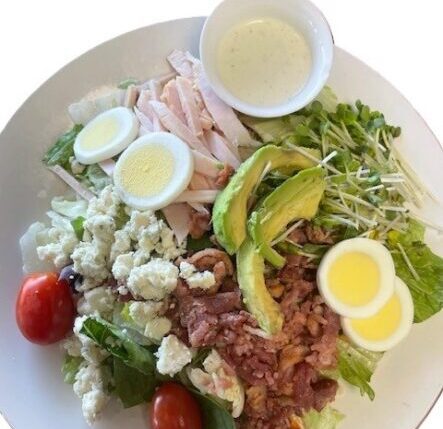 Fresh Mixed Greens, Turkey, Bacon, Tomatoes, Hard-Cooked Eggs, Avocado, Sprouts, & Bleu Cheese Crumbles .