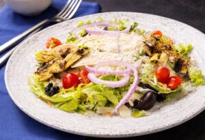 Chipotle Marinated Medallions of Flame Broiled Beef, sliced thin atop Mixed Greens with Cheddar Cheese, Tomatoes, Black Olives, Sour Cream, Avocado Slices & Tortilla Chips. **w/Ranch Dressing sent on the side ***Includes bread/butter & choice of dessert.